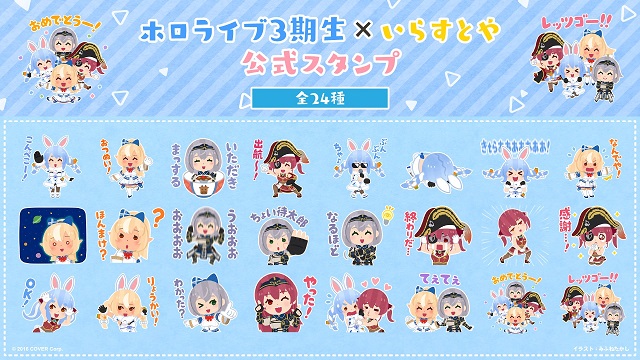 1月24日に発売されたLINEスタンプ(全24種類)、「ホロライブ3期生×いらすとや」の絵柄1点に設定と異なる描写があったとのこと。運営は絵柄差し替え後、再販を行うとのこと。現時点で、LINEスタンプから購入はできない状態となっている。